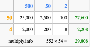 Below is an illustration showing you how to calculate 552 times 54 using the box method, using the instructions above.