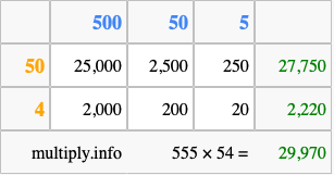 That's all there is to it! As you can see from the box above, the answer to 555 times 54 using the box method is 29,970.