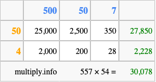 That's all there is to it! As you can see from the box above, the answer to 557 times 54 using the box method is 30,078.
