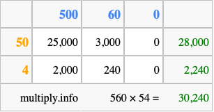 Below is an illustration showing you how to calculate 560 times 54 using the box method, using the instructions above.