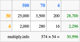 That's all there is to it! As you can see from the box above, the answer to 574 times 54 using the box method is 30,996.