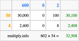 That's all there is to it! As you can see from the box above, the answer to 602 times 54 using the box method is 32,508.
