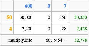 That's all there is to it! As you can see from the box above, the answer to 607 times 54 using the box method is 32,778.