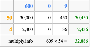 That's all there is to it! As you can see from the box above, the answer to 609 times 54 using the box method is 32,886.