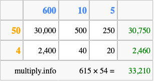 Finally, we add up all the sums we found in step 3 to get our final answer to 615 times 54.