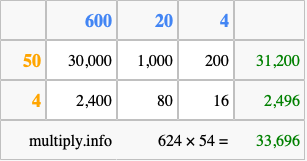 That's all there is to it! As you can see from the box above, the answer to 624 times 54 using the box method is 33,696.