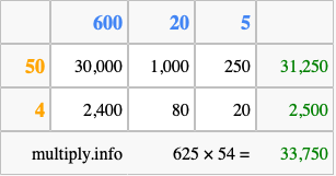 That's all there is to it! As you can see from the box above, the answer to 625 times 54 using the box method is 33,750.