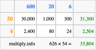 That's all there is to it! As you can see from the box above, the answer to 626 times 54 using the box method is 33,804.