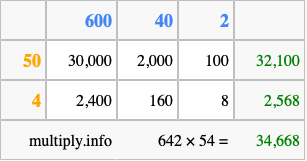 Finally, we add up all the sums we found in step 3 to get our final answer to 642 times 54.