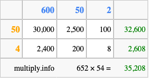 That's all there is to it! As you can see from the box above, the answer to 652 times 54 using the box method is 35,208.
