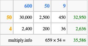 That's all there is to it! As you can see from the box above, the answer to 659 times 54 using the box method is 35,586.