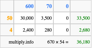 That's all there is to it! As you can see from the box above, the answer to 670 times 54 using the box method is 36,180.