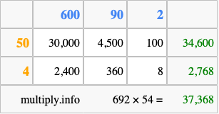 That's all there is to it! As you can see from the box above, the answer to 692 times 54 using the box method is 37,368.