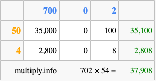 Below is an illustration showing you how to calculate 702 times 54 using the box method, using the instructions above.