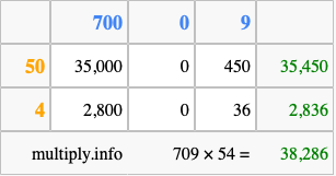 Finally, we add up all the sums we found in step 3 to get our final answer to 709 times 54.