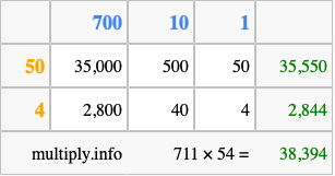 Finally, we add up all the sums we found in step 3 to get our final answer to 711 times 54.