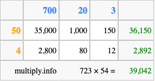 Below is an illustration showing you how to calculate 723 times 54 using the box method, using the instructions above.