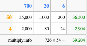 That's all there is to it! As you can see from the box above, the answer to 726 times 54 using the box method is 39,204.