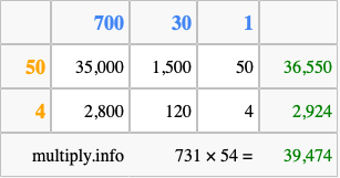 That's all there is to it! As you can see from the box above, the answer to 731 times 54 using the box method is 39,474.