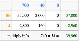 That's all there is to it! As you can see from the box above, the answer to 740 times 54 using the box method is 39,960.