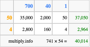That's all there is to it! As you can see from the box above, the answer to 741 times 54 using the box method is 40,014.