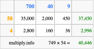 That's all there is to it! As you can see from the box above, the answer to 749 times 54 using the box method is 40,446.