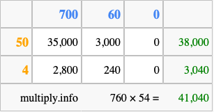 That's all there is to it! As you can see from the box above, the answer to 760 times 54 using the box method is 41,040.