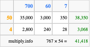 That's all there is to it! As you can see from the box above, the answer to 767 times 54 using the box method is 41,418.