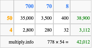 Below is an illustration showing you how to calculate 778 times 54 using the box method, using the instructions above.