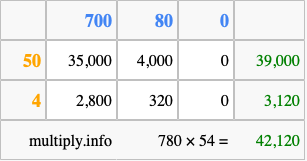Finally, we add up all the sums we found in step 3 to get our final answer to 780 times 54.