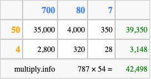 Below is an illustration showing you how to calculate 787 times 54 using the box method, using the instructions above.