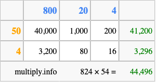 That's all there is to it! As you can see from the box above, the answer to 824 times 54 using the box method is 44,496.