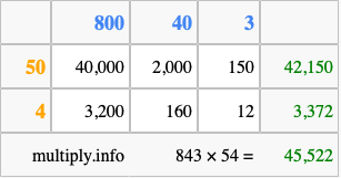 That's all there is to it! As you can see from the box above, the answer to 843 times 54 using the box method is 45,522.