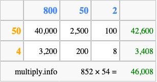 That's all there is to it! As you can see from the box above, the answer to 852 times 54 using the box method is 46,008.