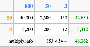 That's all there is to it! As you can see from the box above, the answer to 853 times 54 using the box method is 46,062.