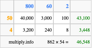 That's all there is to it! As you can see from the box above, the answer to 862 times 54 using the box method is 46,548.