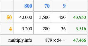 That's all there is to it! As you can see from the box above, the answer to 879 times 54 using the box method is 47,466.