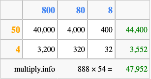 That's all there is to it! As you can see from the box above, the answer to 888 times 54 using the box method is 47,952.