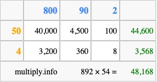 That's all there is to it! As you can see from the box above, the answer to 892 times 54 using the box method is 48,168.