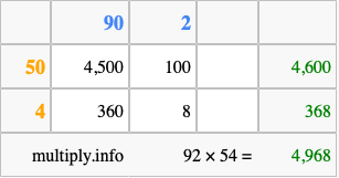 That's all there is to it! As you can see from the box above, the answer to 92 times 54 using the box method is 4,968.