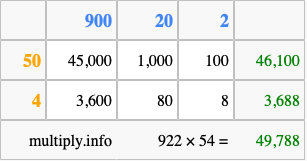 That's all there is to it! As you can see from the box above, the answer to 922 times 54 using the box method is 49,788.