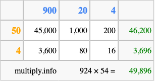 That's all there is to it! As you can see from the box above, the answer to 924 times 54 using the box method is 49,896.