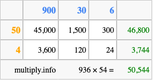That's all there is to it! As you can see from the box above, the answer to 936 times 54 using the box method is 50,544.