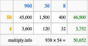 That's all there is to it! As you can see from the box above, the answer to 938 times 54 using the box method is 50,652.