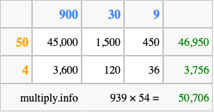 That's all there is to it! As you can see from the box above, the answer to 939 times 54 using the box method is 50,706.