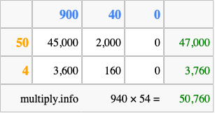 Finally, we add up all the sums we found in step 3 to get our final answer to 940 times 54.