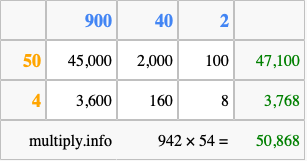 That's all there is to it! As you can see from the box above, the answer to 942 times 54 using the box method is 50,868.