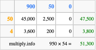 Finally, we add up all the sums we found in step 3 to get our final answer to 950 times 54.