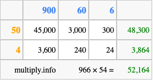 That's all there is to it! As you can see from the box above, the answer to 966 times 54 using the box method is 52,164.
