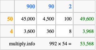 That's all there is to it! As you can see from the box above, the answer to 992 times 54 using the box method is 53,568.